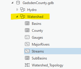 Download the Gadsden County data in a File GDB or FGDB (file Geodatabase), which contain the county boundary, water basins/sub-basins, and streams. Reminder: do NOT place a .gdb folder (actually a FGDB) inside another .gdb folder.
