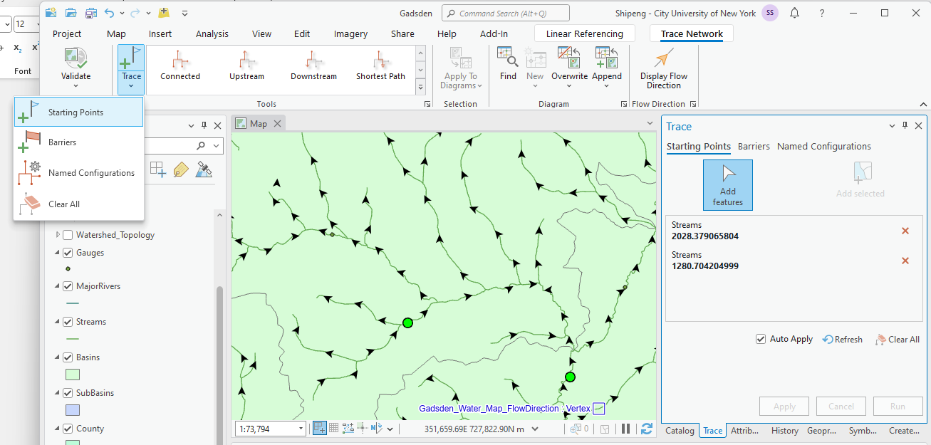 - Then, we can run those Trace Network tools like Connected, Upstream, Downstream, and Shortest Path. These “starting points”, “barriers” will be brought to those tools automatically.