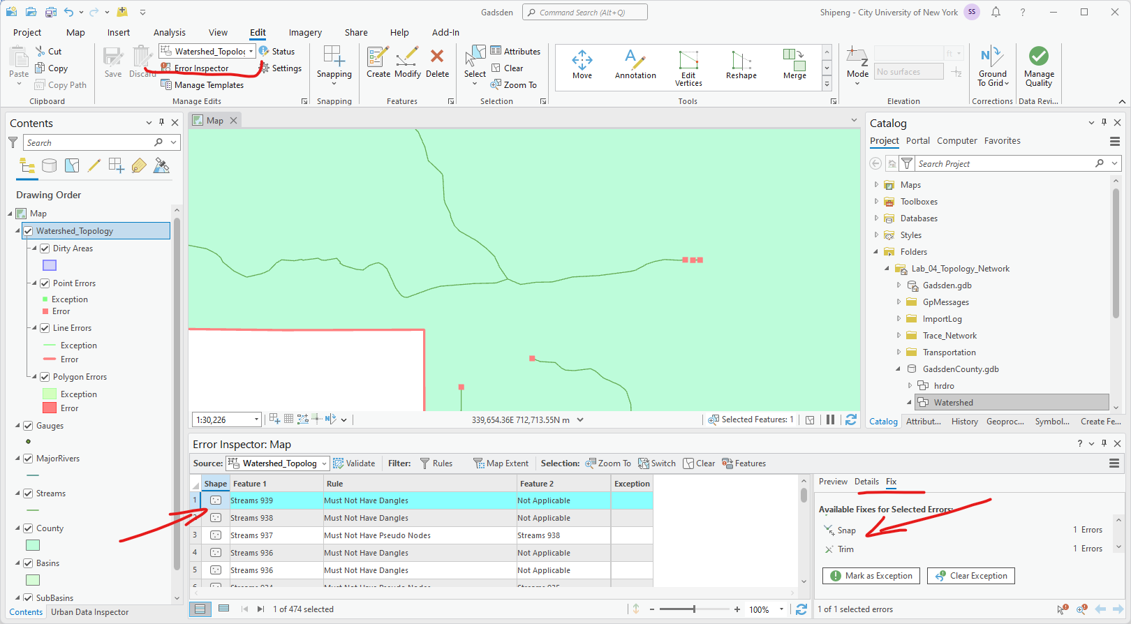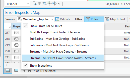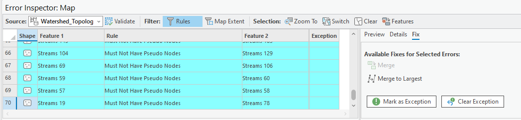 - Then select all the features that violate this rule. ArcGIS Pro has suggested fix for this type of error: Merge to Largest. Basically, this fix will connect those pseudo-nodes to the line-strings of rivers. Once more, in real-world applications, we must make sure such “automatic” fix really fixes errors. Where it cannot, we need to manually edit our data like what we did in the Geodatabase Lab.